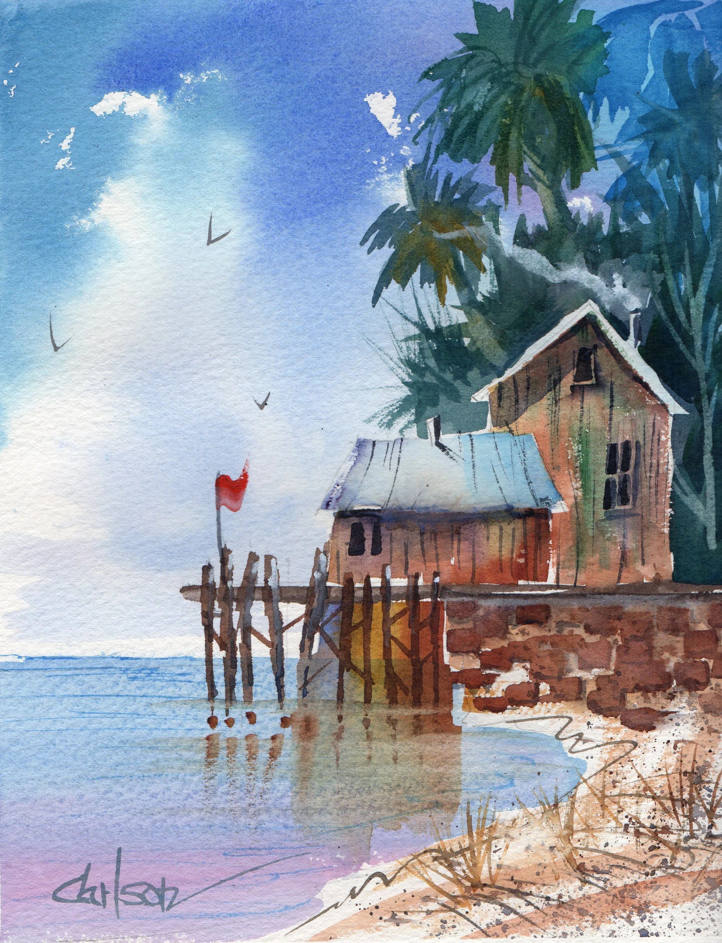 Ed Carlson captures the charm of weathered fishing shacks, quiet waterways, and coastal life in his expressive watercolor paintings. Originally from upstate New York and now based in Satellite Beach, Ed paints the places he loves most—scenes full of light, texture, and timeworn beauty. He also teaches watercolor with a playful, encouraging approach that helps students connect with the joy of painting. His work reflects both his technical skill and his passion for living close to the water.