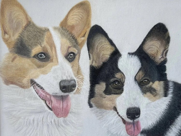 Two mischievous corgi brothers — her own loyal companions — first inspired her to pursue animal portraiture. Their personalities and humor became the heart of her work and fueled her passion for capturing the spirit and individuality of every pet she draws. As her practice evolved, Fiona found special meaning in creating memorial portraits of pets who had passed, offering families a way to hold onto cherished memories even when photographs no longer captured their essence.